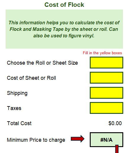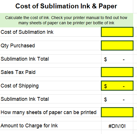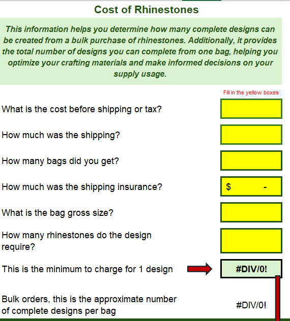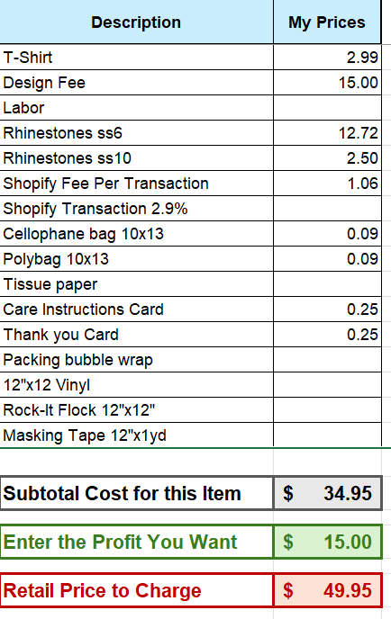 This spreadsheet was created to figure the breakdown cost of materials. Once completed, you will be able to see what the minimum you should charge for your products. There is a tab to breakdown the cost for rhinestones and vinyl. The spreadsheet has been protected to avoid erasing the formulas.